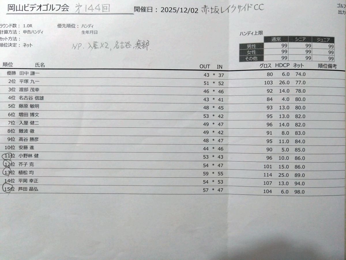 結果は田中さんがグロス80で優勝、平塚さんがグロス103で2位、渡辺さんがグロス92で3位に入りました。